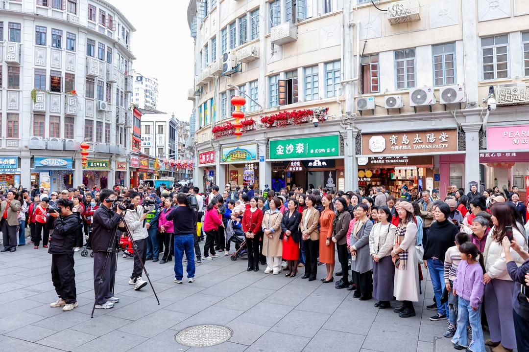 活動現場,多張溫馨合影定格美好瞬間。陳習珍身着藍底金紋旗袍,盡顯東方韻味;母女攜手合影的畫面,更生動展現鷺臺家庭同心同行的溫情力量。百年中山路騎樓羣下,市民遊客紛紛駐足觀賞,有人舉起手機記錄精彩瞬間,有人隨旋律輕聲哼唱。熱鬧人羣與古樸建築相映成趣,勾勒出一幅煙火氣與人文氣息交織的巾幗畫卷。