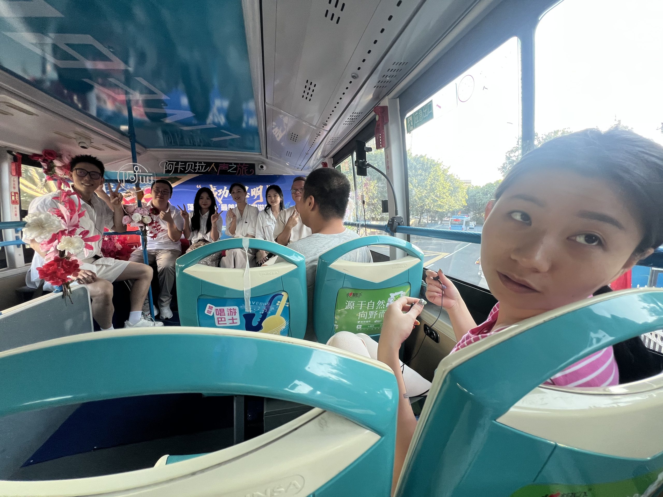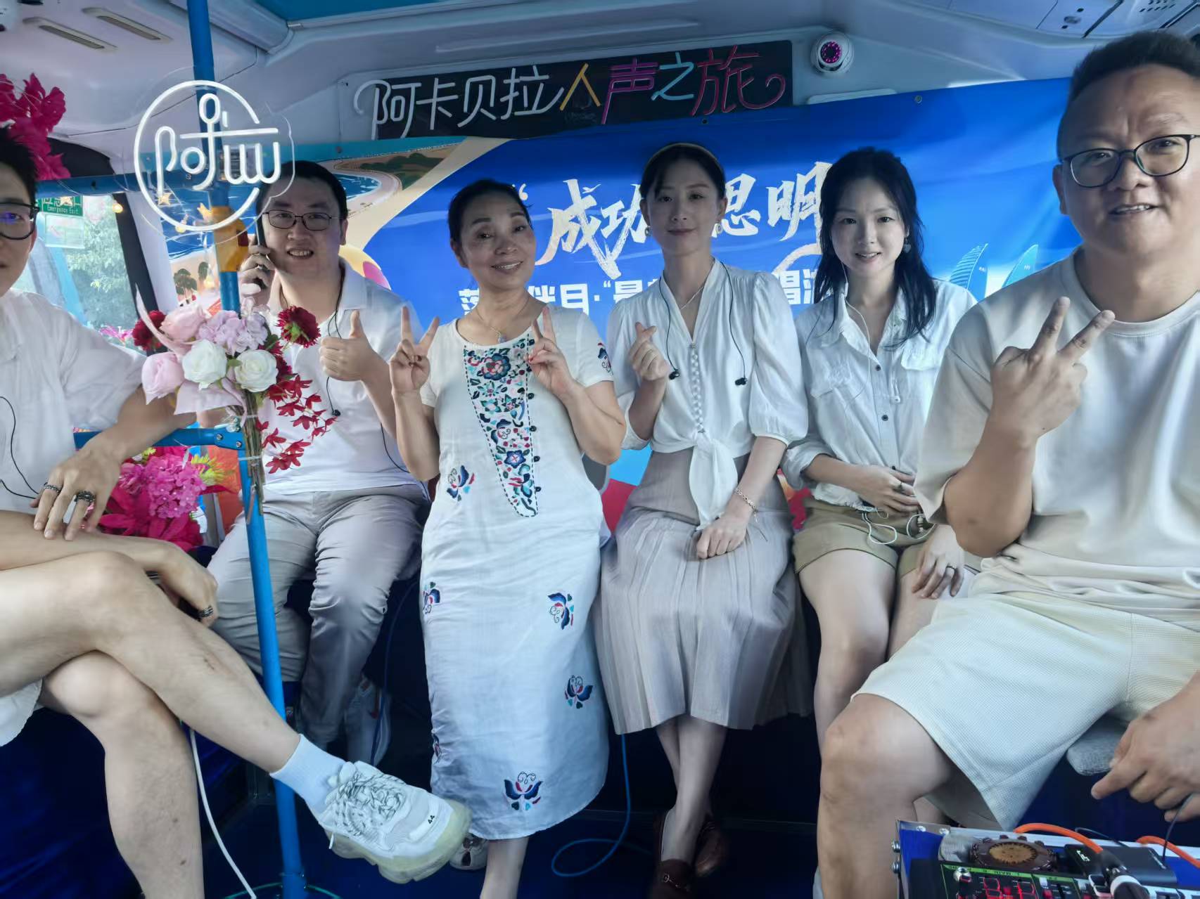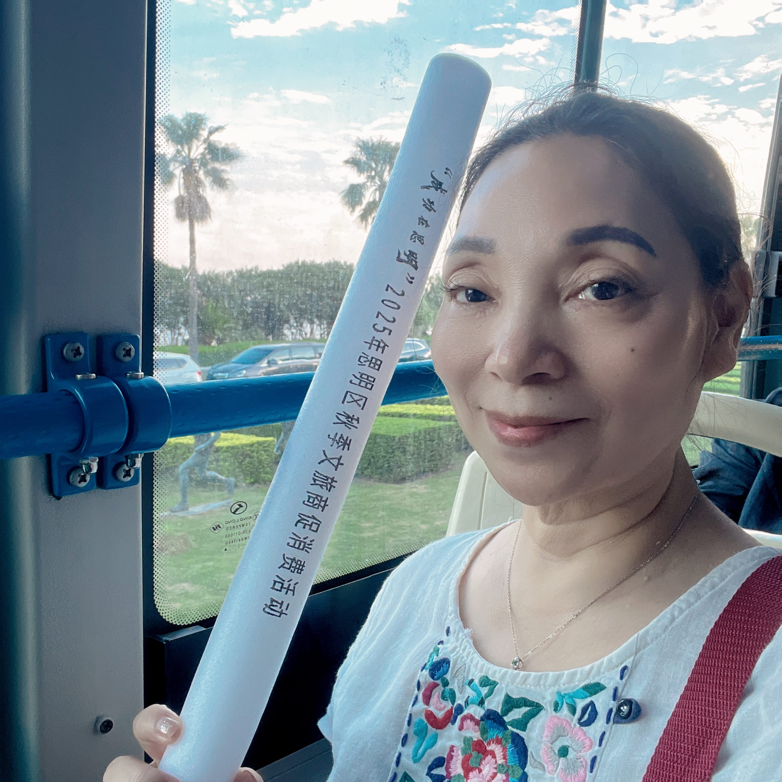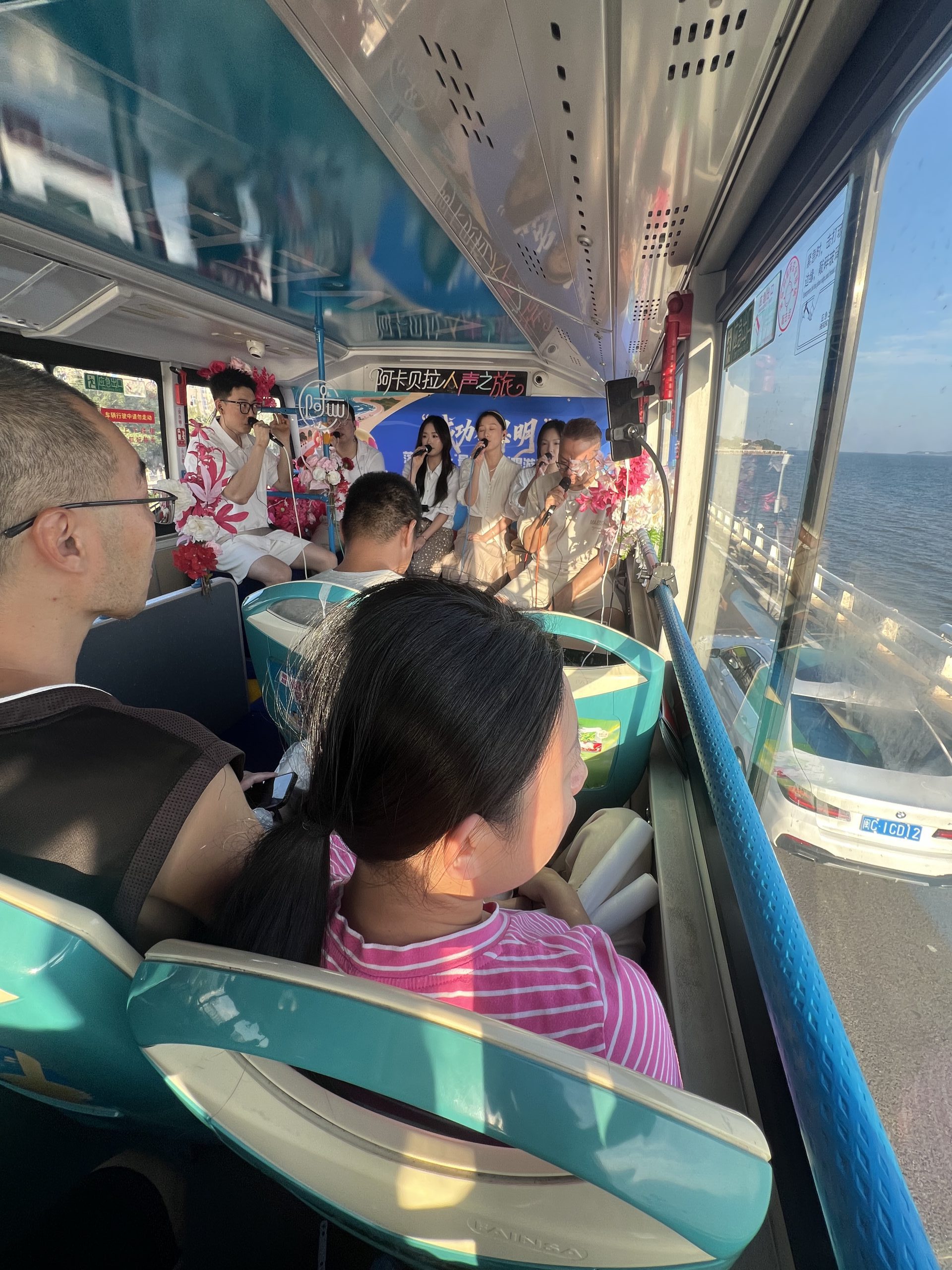 身旁的女兒劉夢緣曾被醫生判定終生無法開口,如今已從臺灣的大學畢業,用鋼琴連接世界。車廂裏純粹的人聲合唱讓這位“星青年”格外動容,她指尖輕輕模擬琴鍵律動:“沒有樂器的聲音好乾淨,像廈門的海風一樣自然。”在她眼中,音樂與風景都是不分邊界的語言,“以前覺得廈門的浪漫是鼓浪嶼的琴聲,現在發現,連巴士上的旋律都在說‘歡迎’,這種溫暖不用說話也能懂。”當《廈門親像一首歌》的旋律響起時,她跟着輕輕哼唱,眼中閃爍着共鳴的光亮。