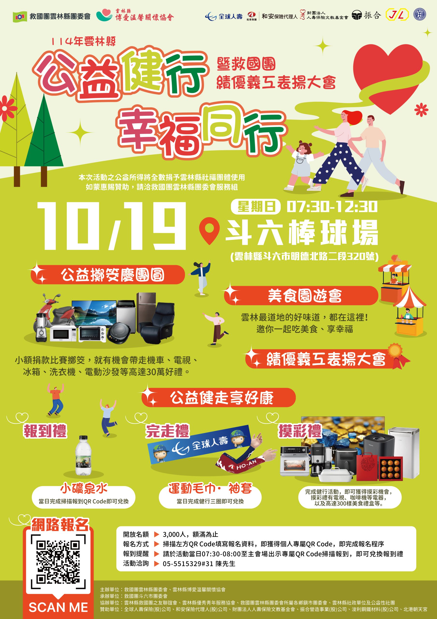 由救國團雲林縣團委會與雲林縣博愛温馨關懷協會聯合主辦的「114年雲林縣【公益健行.幸福同行】暨救國團績優義工表揚大會」,將於10月19日(星期日)上午7時30分,在斗六棒球場旁廣場熱鬧登場。今年活動以「園遊會結合公益健行」為亮點,並融入ESG環境永續概念,邀請縣內各社福單位、公益團體及民眾共襄盛舉,一起用行動實踐公益、傳遞愛心。