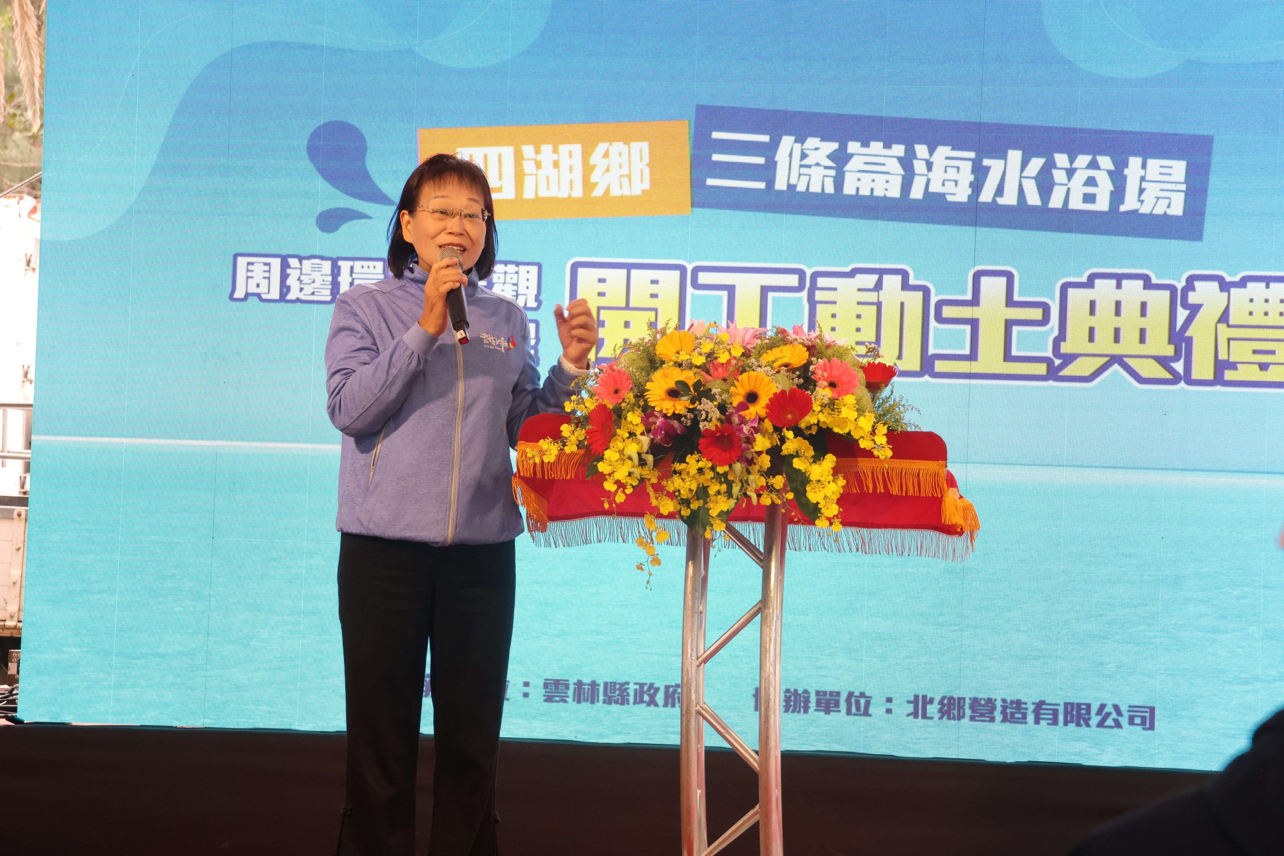 副縣長謝淑亞表示,近幾年透過海洋音樂季及國際風箏衝浪活動,已經成功打開三條崙的知名度。今日我們為「三條崙海水浴場周邊環境景觀改善工程」動土,工程經費近1億4千萬,未來將結合三條崙海洋教育中心、四湖海岸植物園與三條崙濱海秘境等據點,透過海堤自行車道與步道系統,串起海清宮、社區聚落與海岸景點,兼顧海堤安全、海洋教育、生態保育與地方創生,打造整個濱海地區的觀光休閒軸帶,讓更多學校、家庭與國內外遊客看得見海、走得到海、親近海洋。